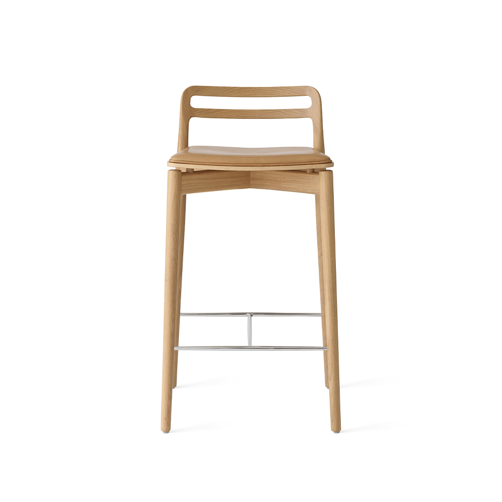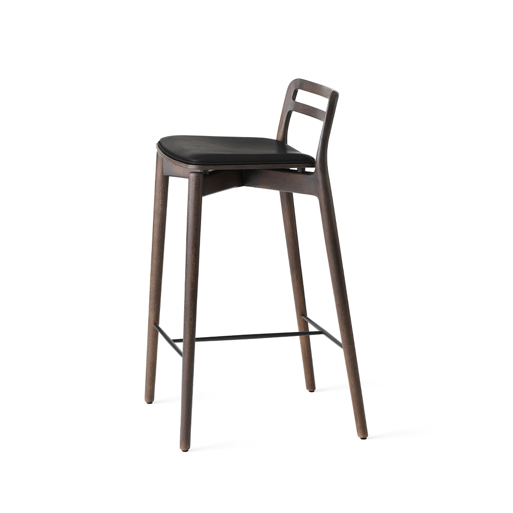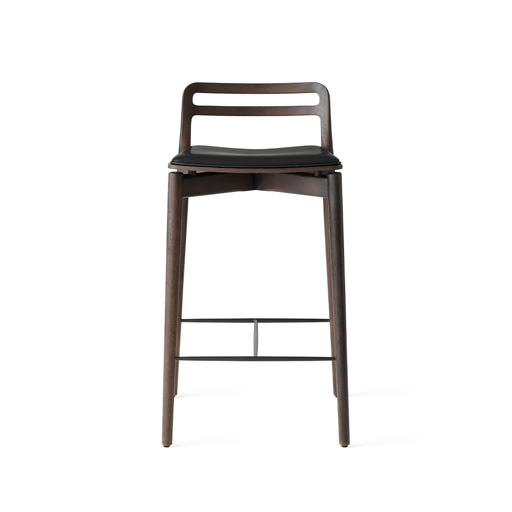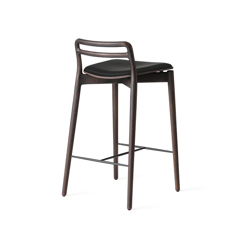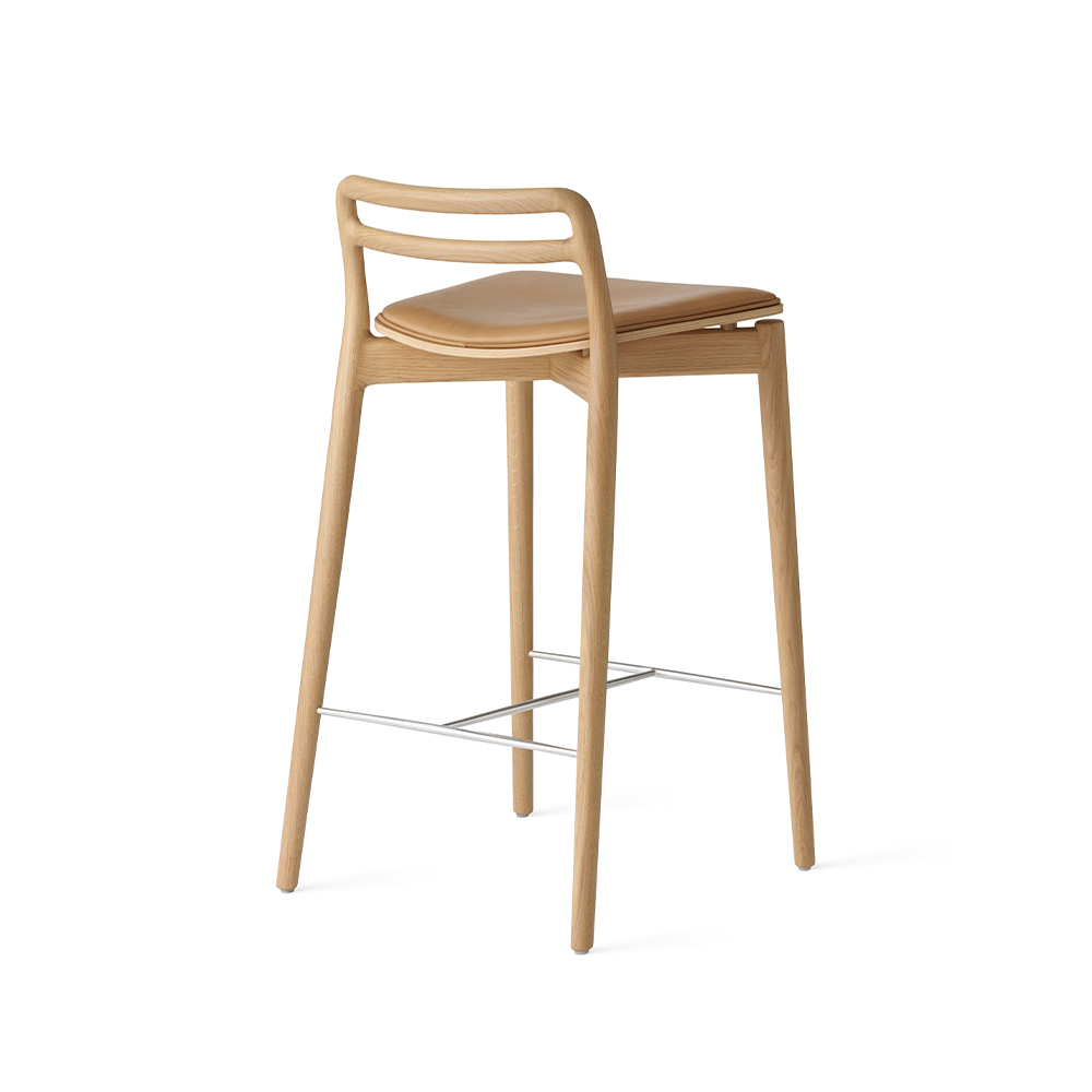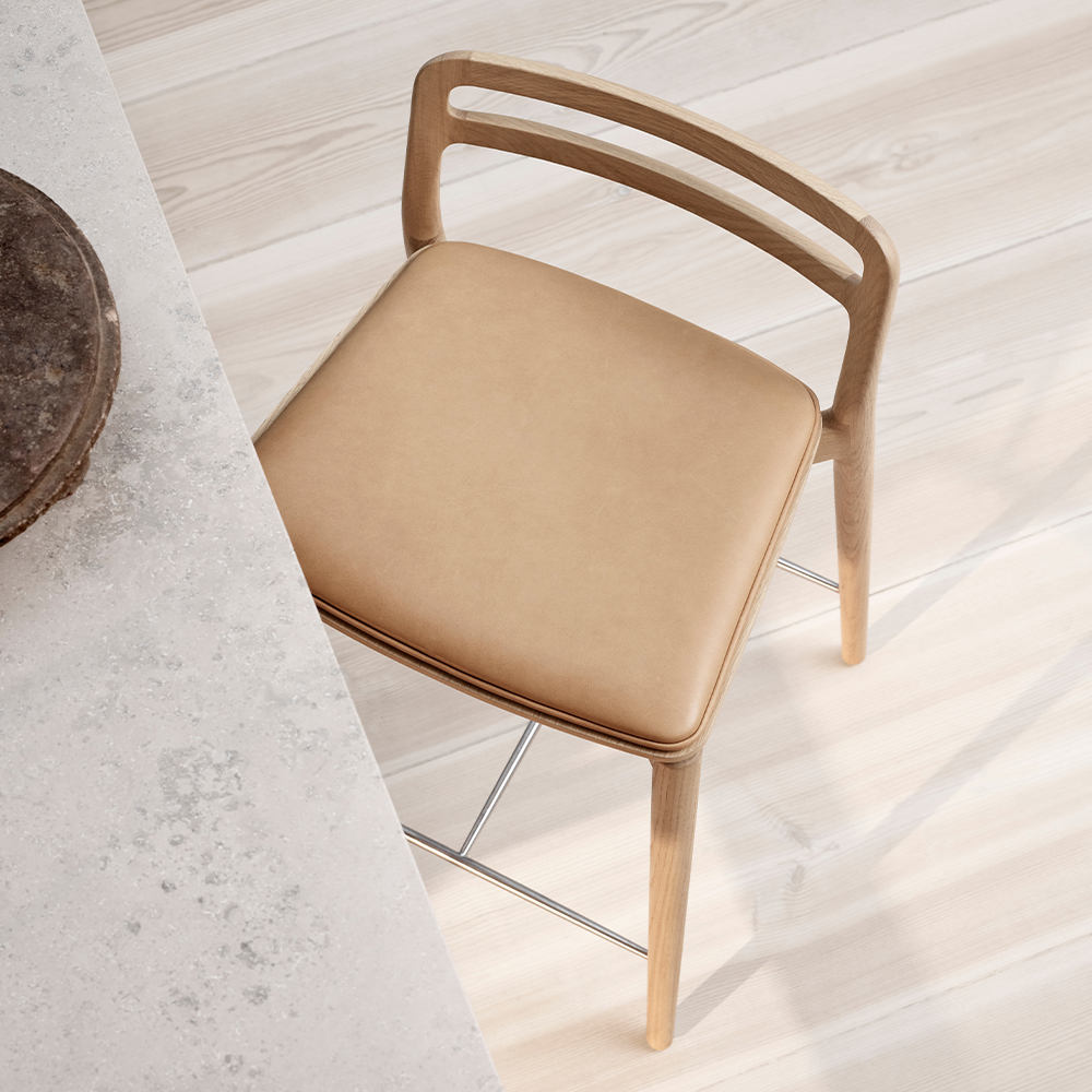Vipp Cabin Counter Stool er designet til køkken- og barområder, hvor funktionalitet, komfort og æstetik skal gå hånd i hånd. Skamlen er udført i massivt egetræ med et let svævende finersæde, som er polstret med sort læder for optimal siddekomfort. Den integrerede fodstøtte i stål sikrer stabilitet og ergonomisk støtte, hvilket gør stolen velegnet til både private og professionelle miljøer med høj daglig brug.