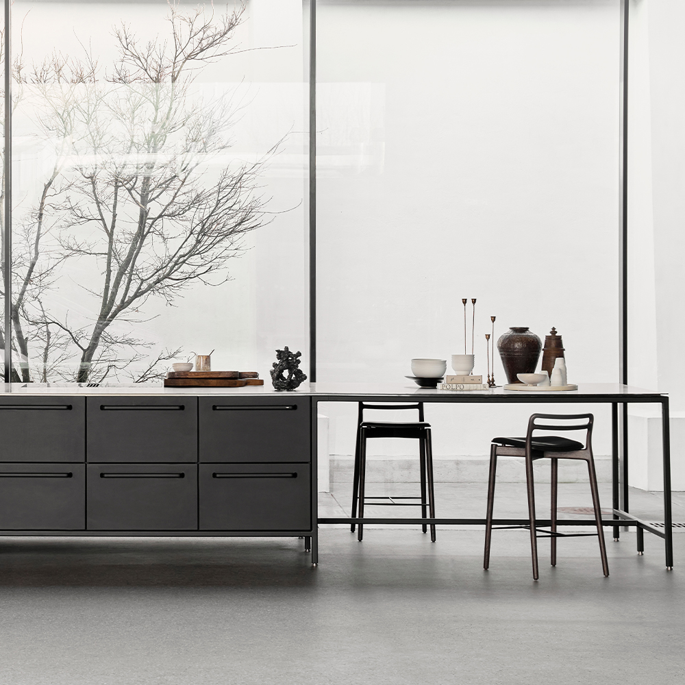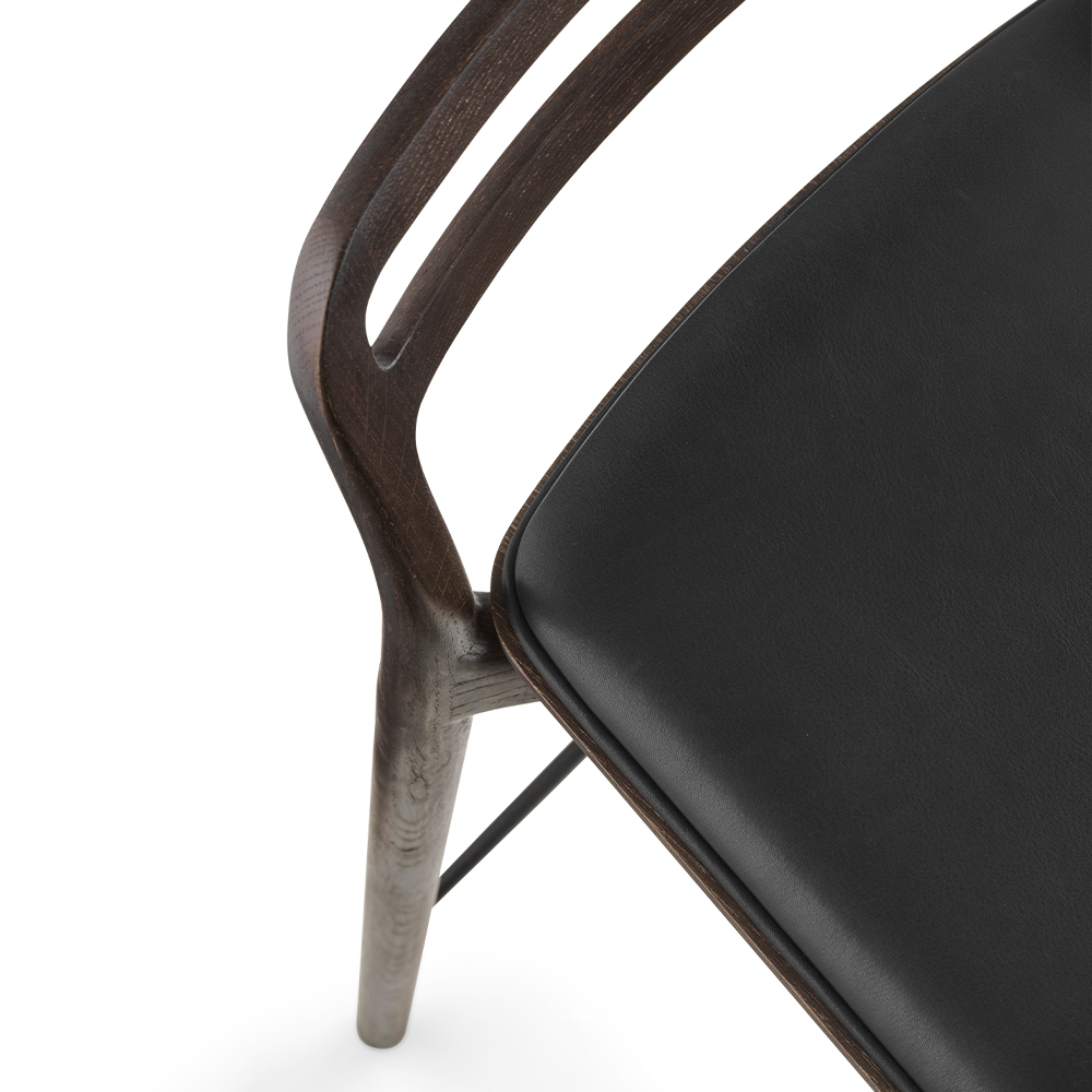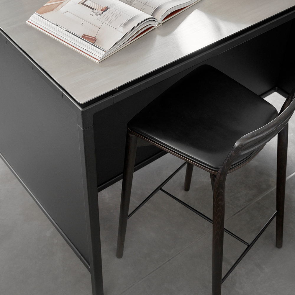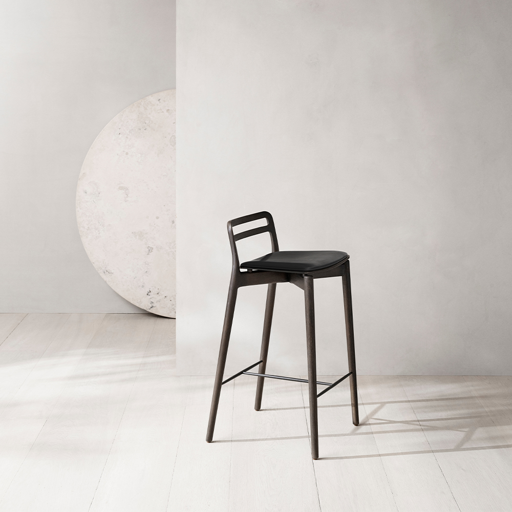 Det gennemtænkte design kommer til udtryk i de afrundede former og den præcise konstruktion, hvor usynlige samlinger skaber et rent og sammenhængende udtryk. Resultatet er en barstol, der fremstår som udskåret i ét stykke og lever op til Vipp’s høje standarder for kvalitet, holdbarhed og håndværk.