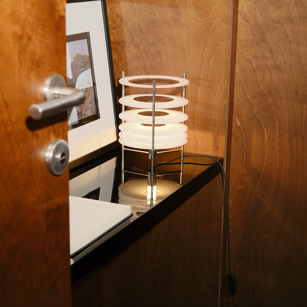 Topuro er en bordlampe fra Parachilna, designet af Guido Valín, og den adskiller sig fra mange andre lamper ved at arbejde meget bevidst med, hvordan lys opleves i rummet. I stedet for én samlet skærm er lyset opdelt i en række transparente akrylskiver, som giver lampen et roligt, næsten rytmisk udtryk. Det er en lampe, man lægger mærke til – uden at den larmer visuelt.