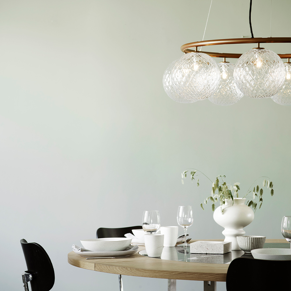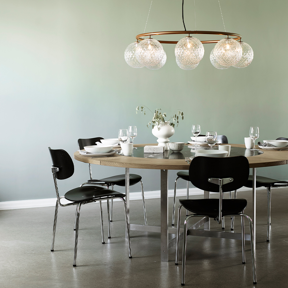 Den prisvindende Miira-kollektion, udvides her med en ny cirkulær lysekrone. Lysekronen har et klassisk udtryk og kan både hænge lavt eller højt i rummet. Højden justeres nemt fra 45 til 250 cm gennem et specielt wiresystem.