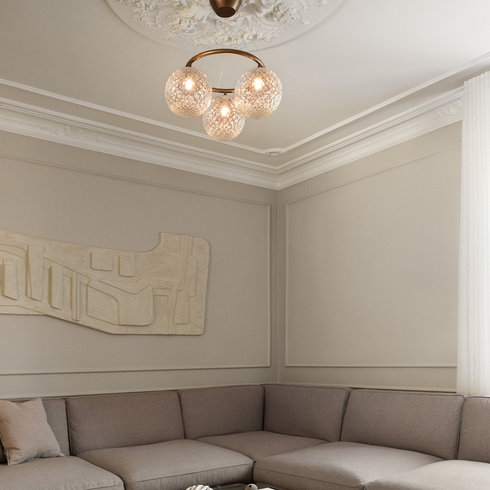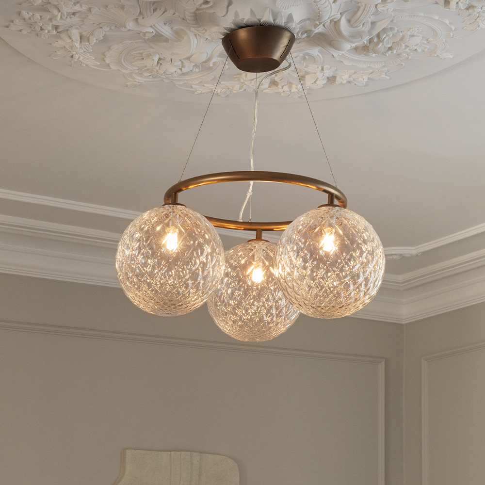 De runde Miira Circular chandeliers er en moderne fortolkning af den klassiske lysekrone. Miira 3 Circular er den mindste af de tre runde Miira lysekroner med en diameter på blot Ø54 cm. Den runde metalring er pulverlakeret i en gylden messingfarve og holder 3 mundblæste glaskupler i klart optisk glas, som spreder et sanseligt lys. Den enkle formgivning og beskedne størrelse gør Miira 3 Circular anvendelig i mange indretningssammenhænge herunder i soveværelset, hvor lysekronen kan udnytte den åbne position i midten af loftet over sengen, og sprede et atmosfærisk lys.