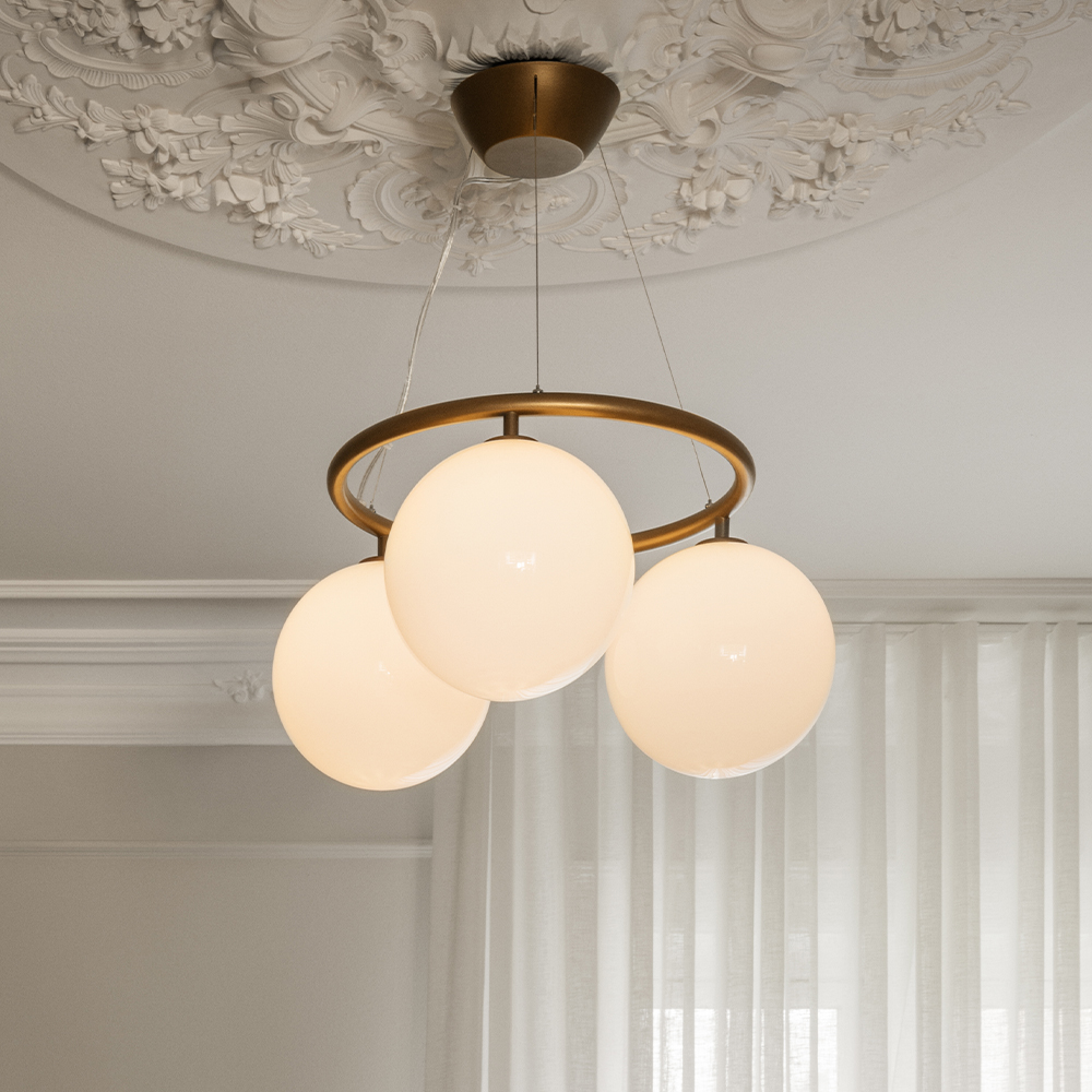De runde Miira Circular chandeliers er en moderne fortolkning af den klassiske lysekrone. Miira 3 Circular er den mindste af de tre runde Miira lysekroner med en diameter på blot Ø54 cm. Den runde metalring er pulverlakeret i en gylden messingfarve og holder 3 mundblæste glaskupler i klart optisk glas, som spreder et sanseligt lys. Den enkle formgivning og beskedne størrelse gør Miira 3 Circular anvendelig i mange indretningssammenhænge herunder i soveværelset, hvor lysekronen kan udnytte den åbne position i midten af loftet over sengen, og sprede et atmosfærisk lys.