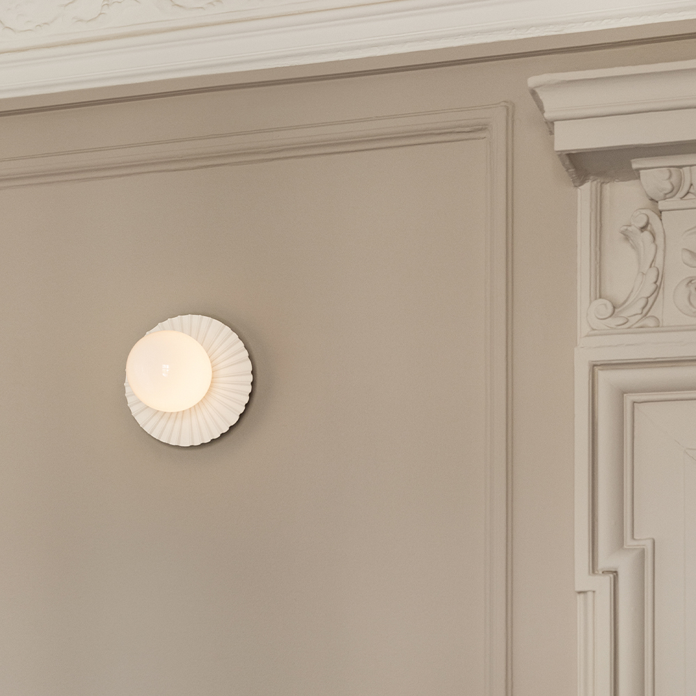 Liila Muuse Small er en lille væg- og loftlampe med et legende udtryk. Lampen består af en bagplade udført i gyldent metal, som komplementerer det opalhvide glas. Den organiske form og riflede struktur skaber dekorative lys- og skyggereflektioner, når lampen er tændt. Med sin beskedne størrelse, kan Liila Muuse Small lyse en trappeopgang op, da den ikke tager meget plads på væggen. Lampen har desuden en IP44 tæthedsgrad, og er godkendt til montering på badeværelset.