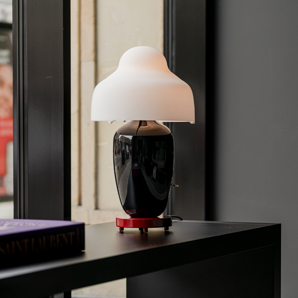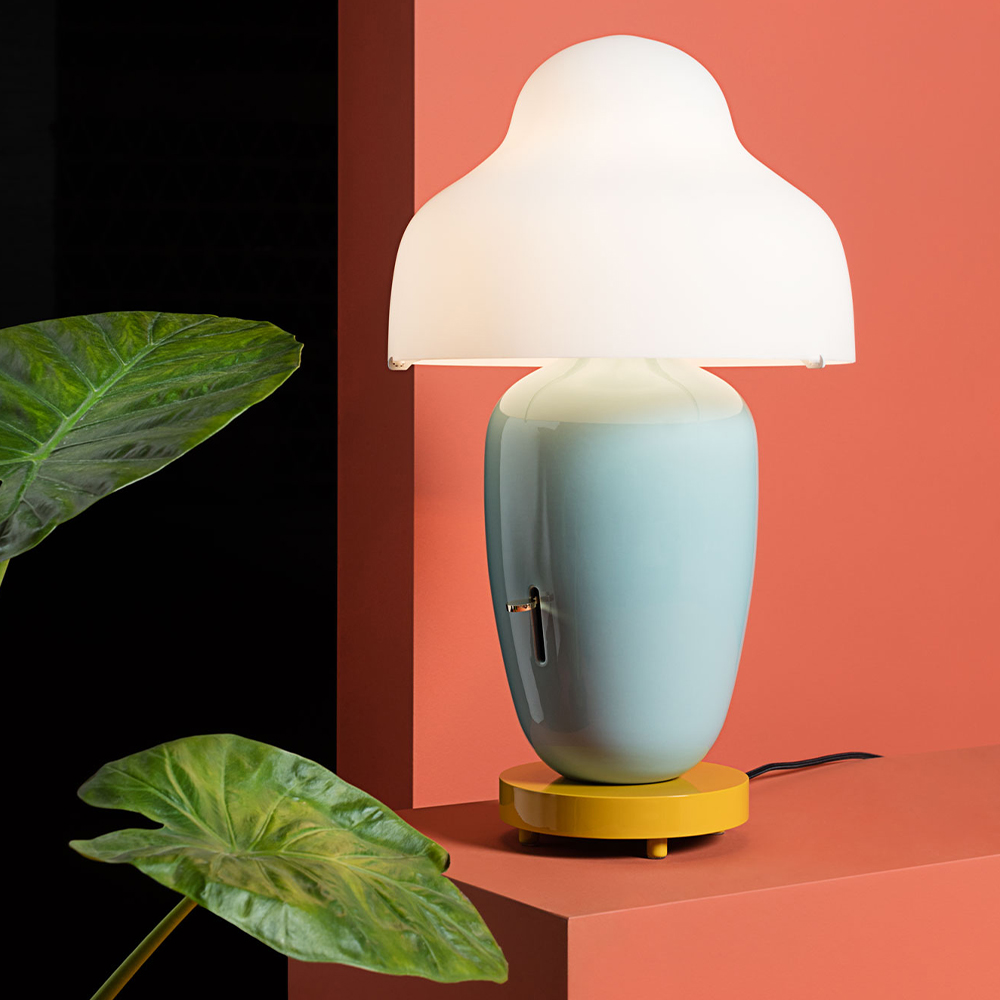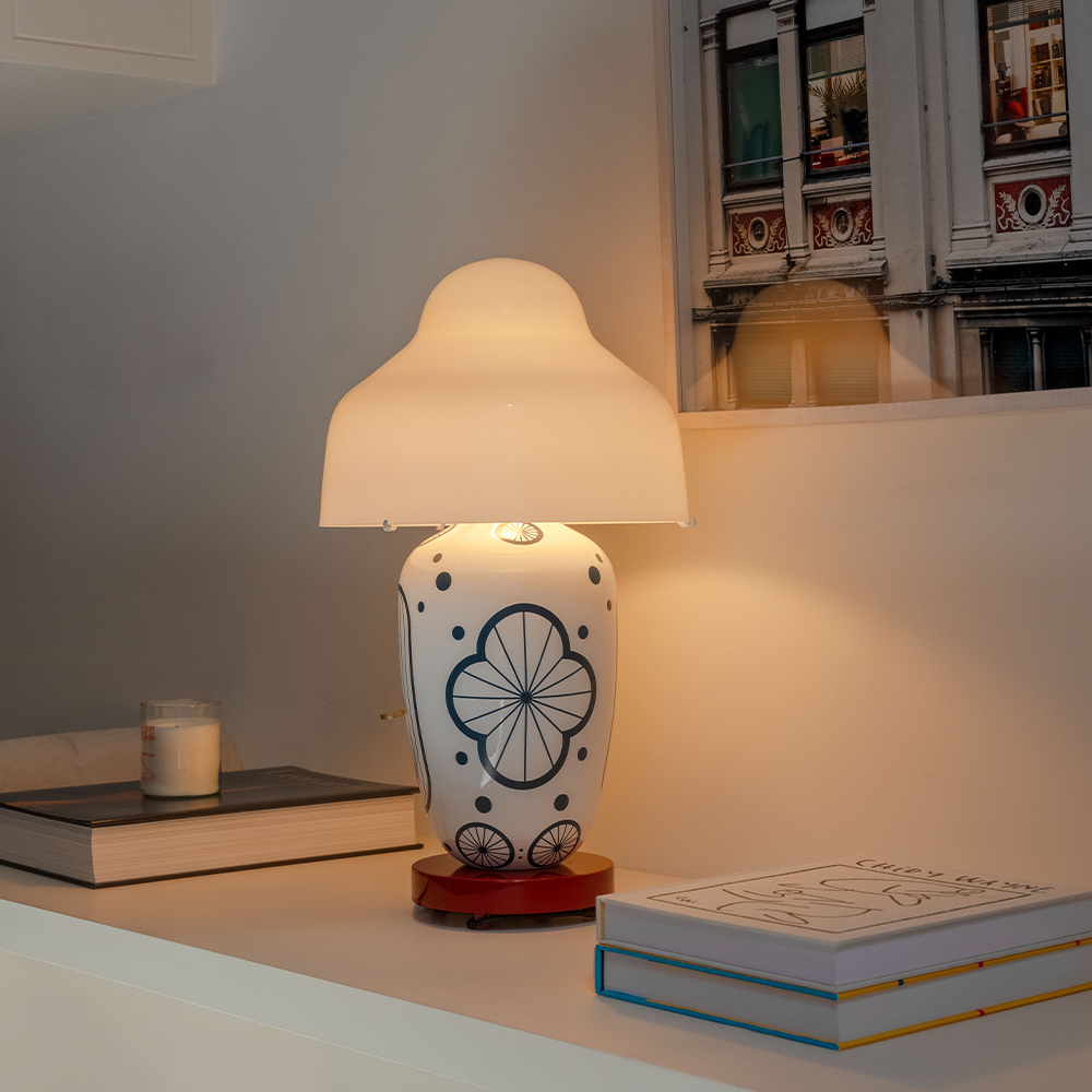 Lampens opbygning kombinerer en mundblæst opalglas-skærm med en glaseret keramisk krop og en base i lakeret træ. Det giver et varmt og behageligt lys, som falder blødt ud i rummet. Man kan tydeligt mærke håndværket, når man står tæt på – både i glasset og i keramikken – og små variationer i overflader og glasering er en naturlig del af udtrykket. Det betyder også, at hver lampe har sin egen karakter.