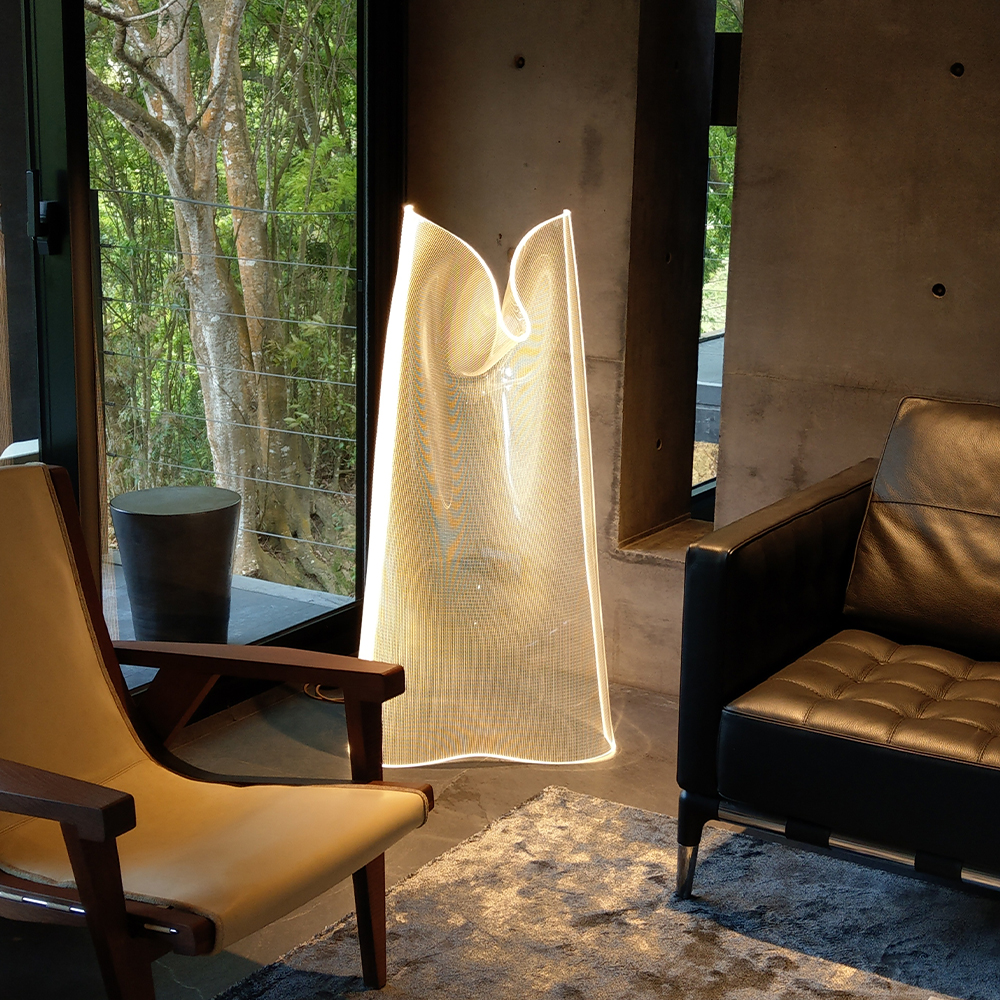 Gweilo Han GR er den største variant i Parachilnas serie af Gweilo gulvlamper, hvor materialitet, lys og form smelter sammen til et markant og skulpturelt udtryk. Lampen er udført i termoformet akryl og håndformet én efter én, hvilket skaber unikke variationer i overflade og silhuet. Den transparente akryl skaber en let, næsten vægtløs tilstedeværelse, der fremhæver lampens organiske form samtidigt med, at den bidrager til rummets visuelle atmosfære.