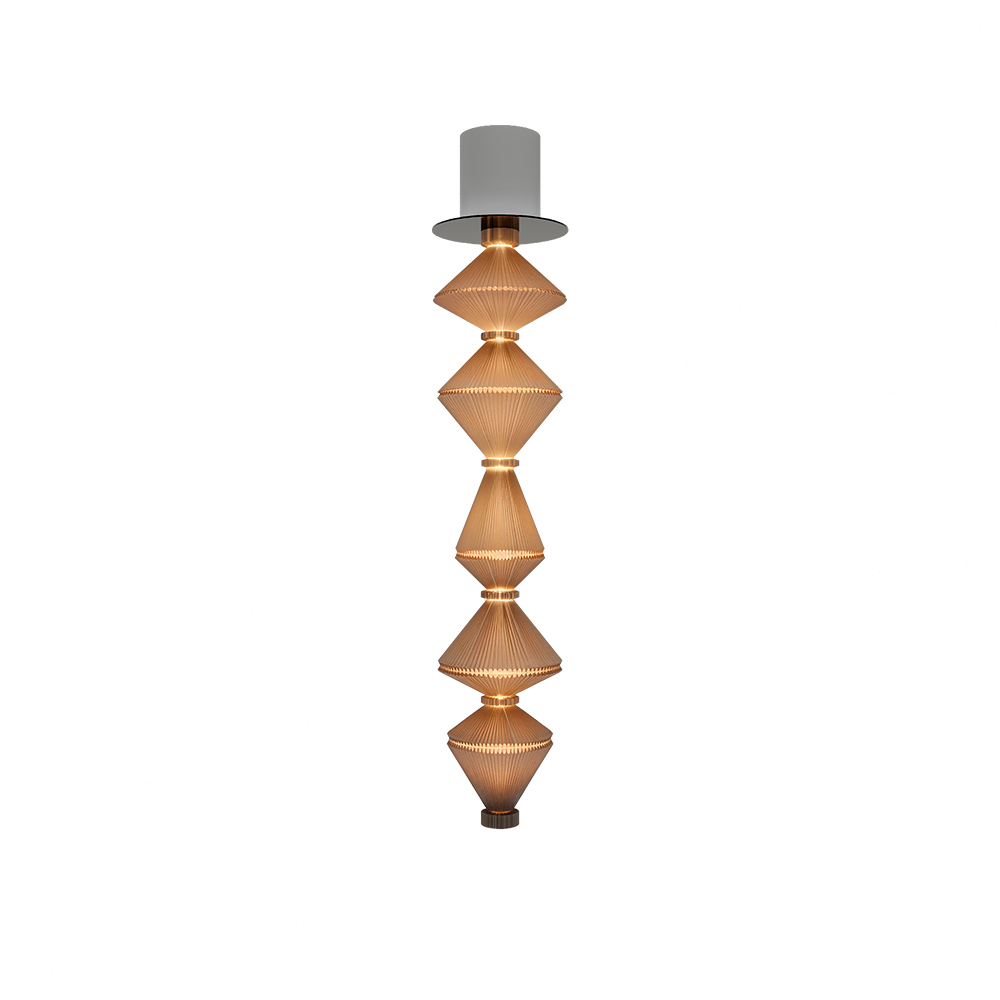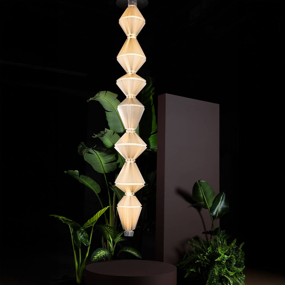 Oïphorique T er en skulpturel pendel fra Parachilna, udviklet i samarbejde med Atelier Oï, hvor lys, bevægelse og form smelter sammen i én samlet oplevelse. Lampen er udstyret med en mekanisk rosette, som får lampens elementer til at bevæge sig roligt op og ned i en blid, gentagende rytme – en bevægelse der kan opleves som en langsom vejrtrækning. Denne subtile dynamik giver lampen en levende tilstedeværelse og tilfører rummet en sanselig og næsten meditativ atmosfære.