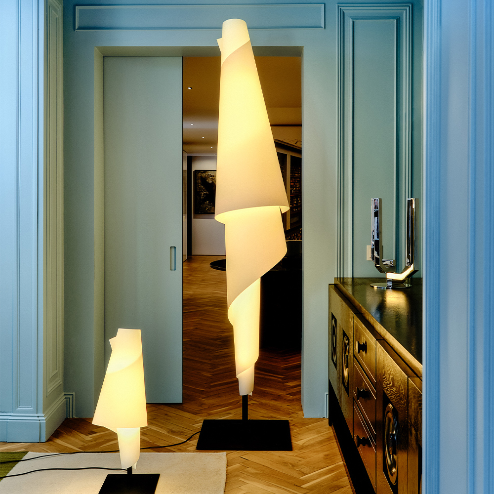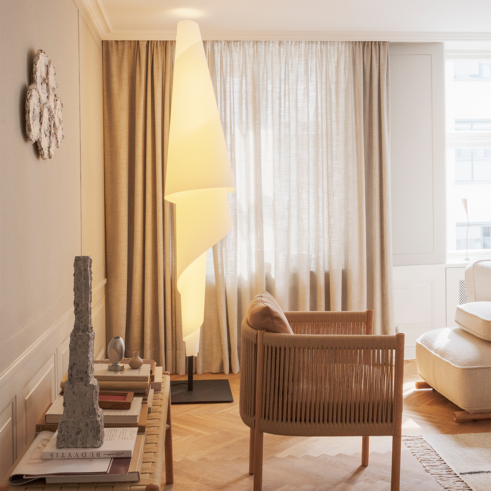 Lyset filtreres blødt gennem diffuseren og skaber en varm og behagelig belysning med tydelig tekstur. Kombinationen af den faste stålmast og det lette, næsten stoflige materiale giver lamperne en fin balance mellem noget grafisk og noget meget sanseligt. Det er tydeligt, at materialerne er valgt med omtanke, og at samlingen er en aktiv del af designet – ikke noget, der skjules.