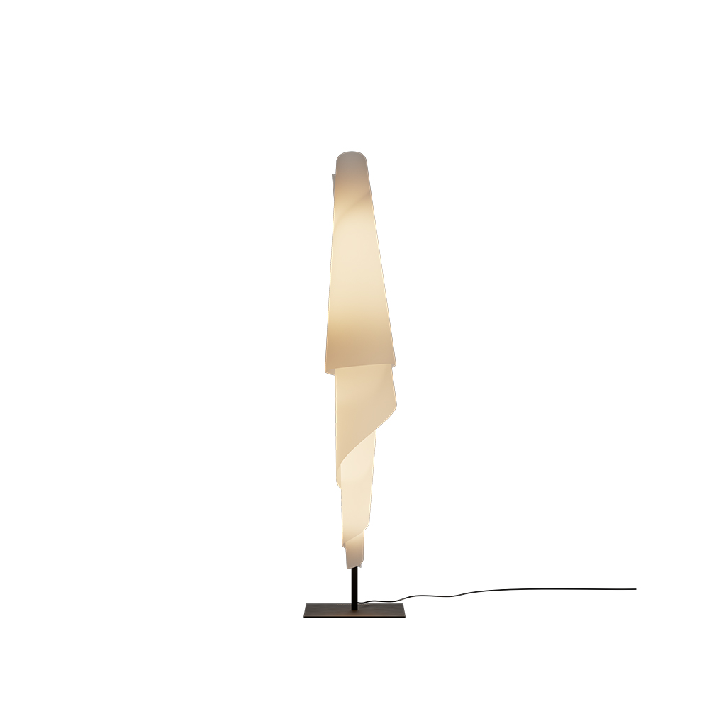 Lyset filtreres blødt gennem diffuseren og skaber en varm og behagelig belysning med tydelig tekstur. Kombinationen af den faste stålmast og det lette, næsten stoflige materiale giver lamperne en fin balance mellem noget grafisk og noget meget sanseligt. Det er tydeligt, at materialerne er valgt med omtanke, og at samlingen er en aktiv del af designet – ikke noget, der skjules.