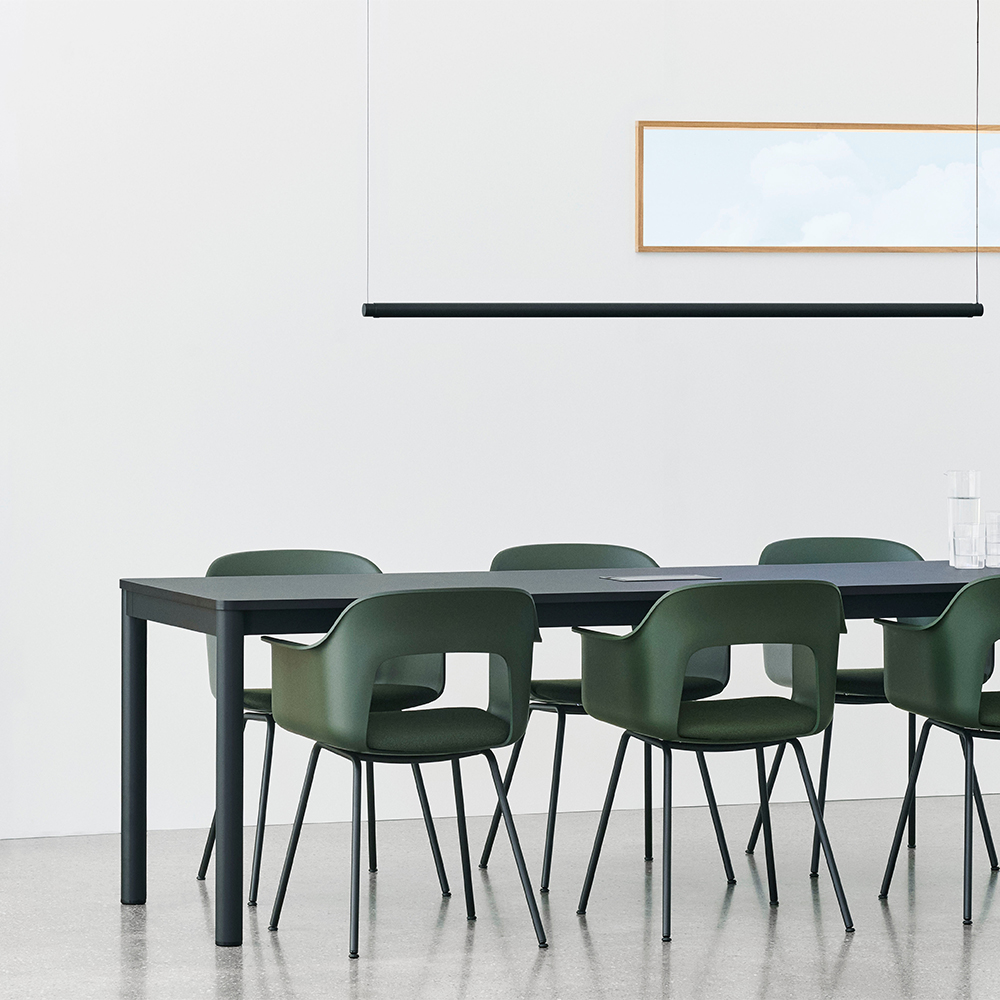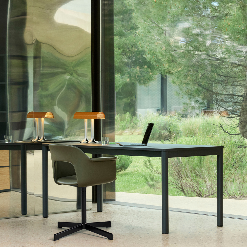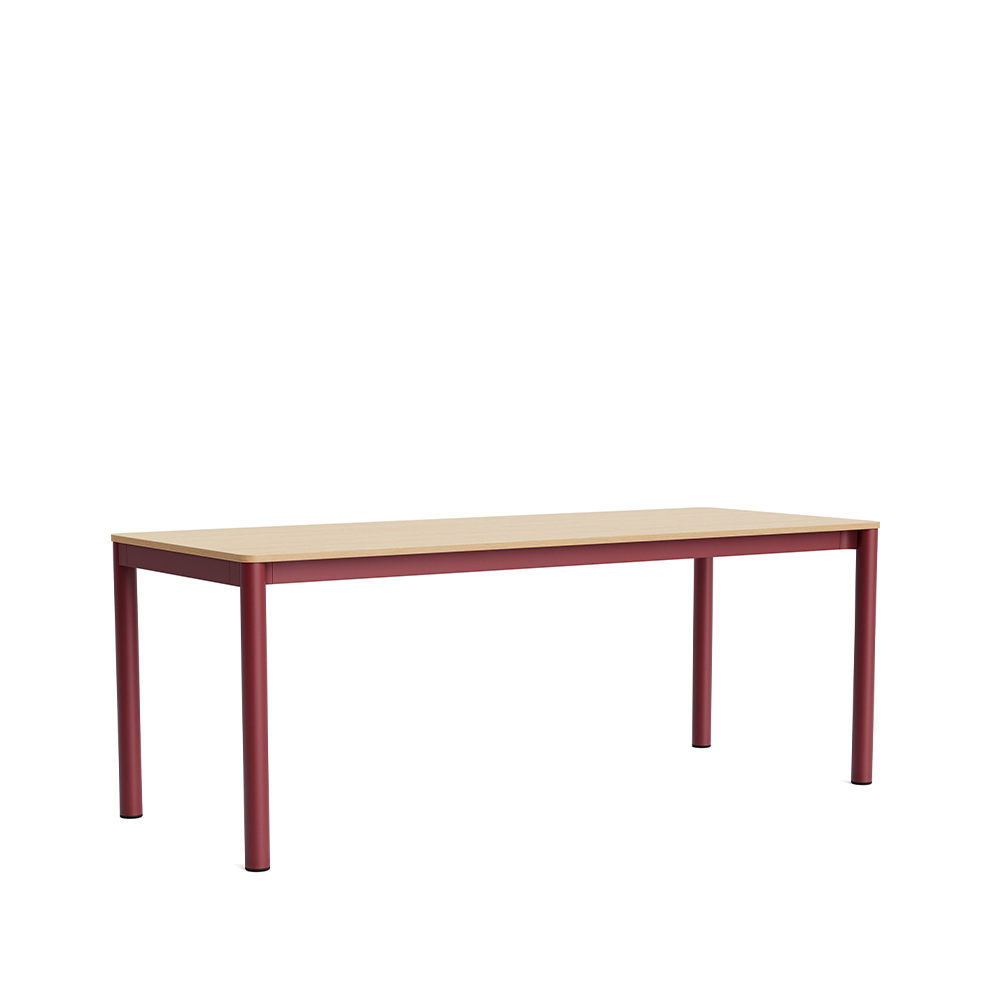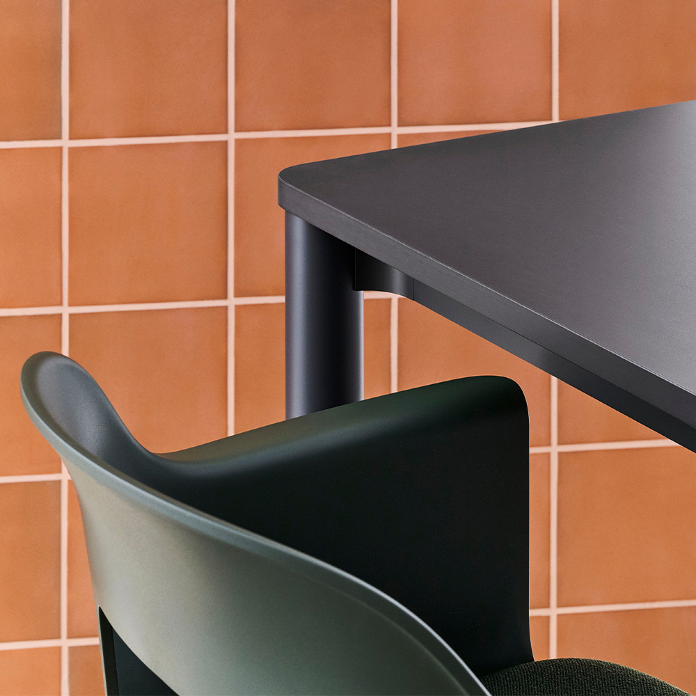 Bordpladen fås i flere materialer, herunder laminat, træ eller Really Textile Tabletop fra Kvadrat, der er fremstillet af op til 70 % genanvendte tekstiler. Materialevalget giver mulighed for at tilpasse bordets karakter til både møderum, spiseområder og fleksible arbejdszoner.