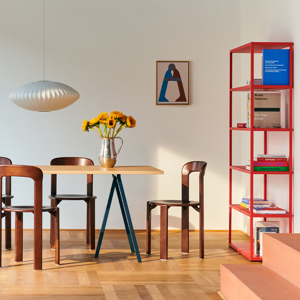 New Order System designet af Stefan Diez for HAY er et fleksibelt opbevaringssystem udviklet til at kunne tilpasses forskellige rum og funktioner. Den åbne gitterkonstruktion danner en enkel og robust ramme, hvor hylder, skabe og moduler kan kombineres i mange forskellige konfigurationer. Resultatet er et system, der kan vokse og ændre sig i takt med behovene – fra mindre opbevaringsløsninger til større, sammenhængende reolsystemer.