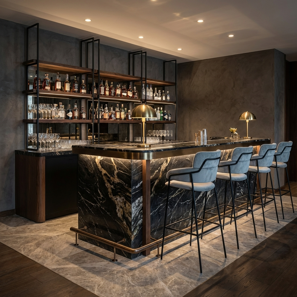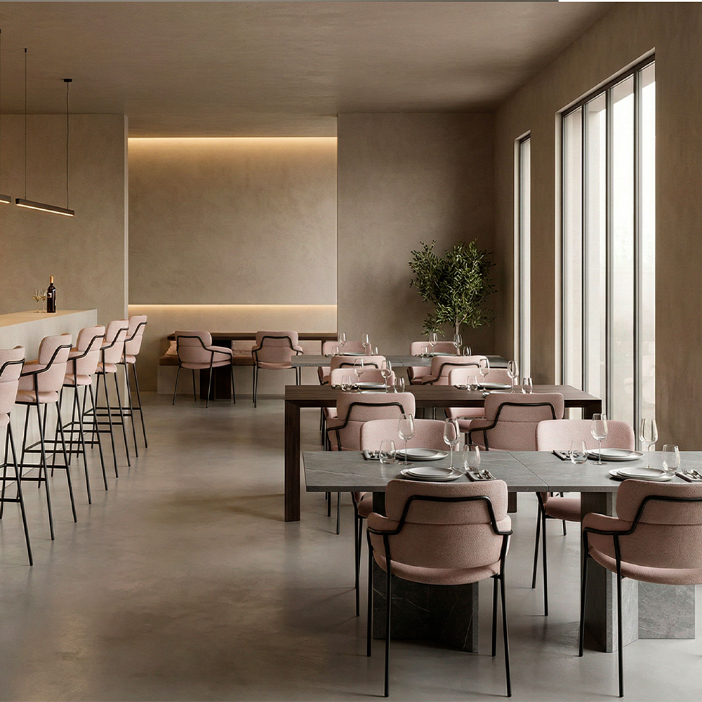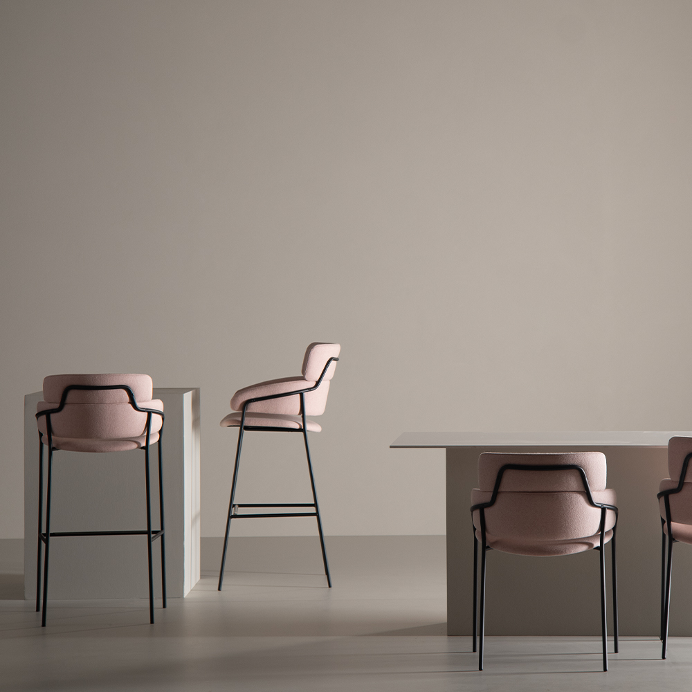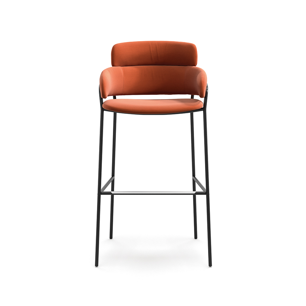 Stellet er udført i stål og kan vælges i flere farver, så det kan tilpasses rummets øvrige metaltoner eller kontrasteres med tekstilerne. Sæde og ryg er polstret med fokus på komfort over længere tid, og barstolen fås med en bred vifte af polstringer i både tekstil og læder – du kan dermed arbejde med både funktionelle krav og æstetiske ønsker i ét samlet møbelvalg.