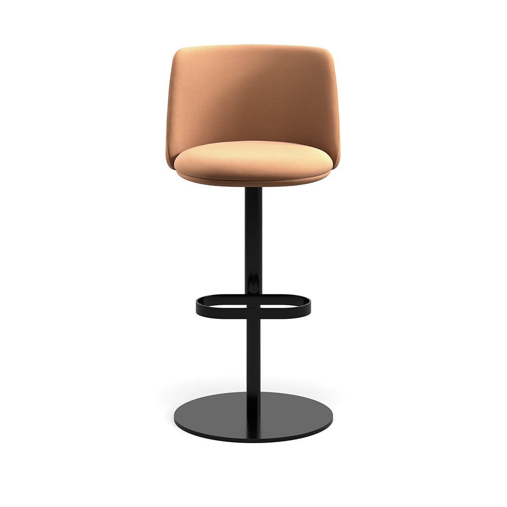 Barstolen er udført med drejefunktion og self-aligning mekanisme, så sædet automatisk vender tilbage til sin oprindelige position. Stellet fås i forkromet eller lakeret, monokrom finish, kombineret med en rund stålbase på Ø450 mm, der sikrer stabilitet og et let visuelt aftryk. Sæde og ryg er opbygget i bøgekrydsfiner og polstret med flammehæmmende polyuretanskum, hvilket giver en behagelig og støttende siddeoplevelse.