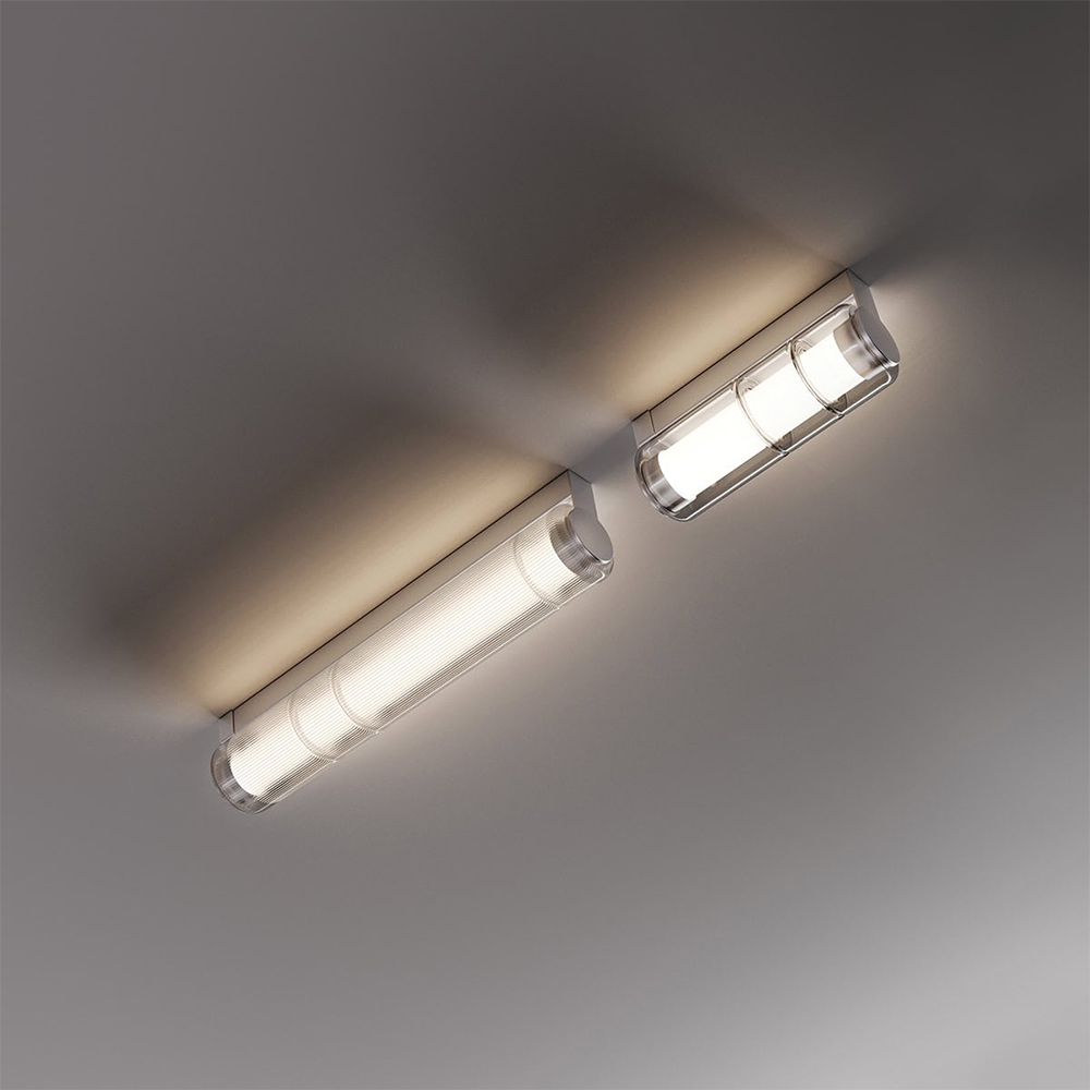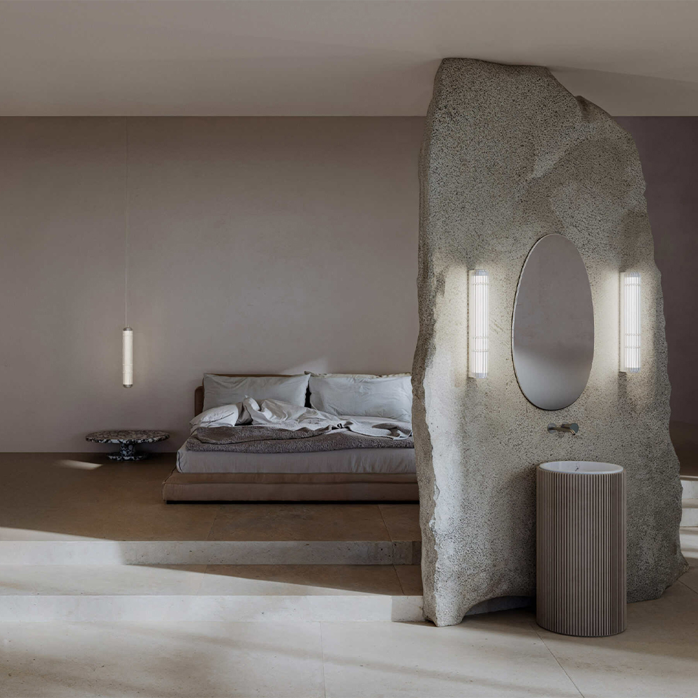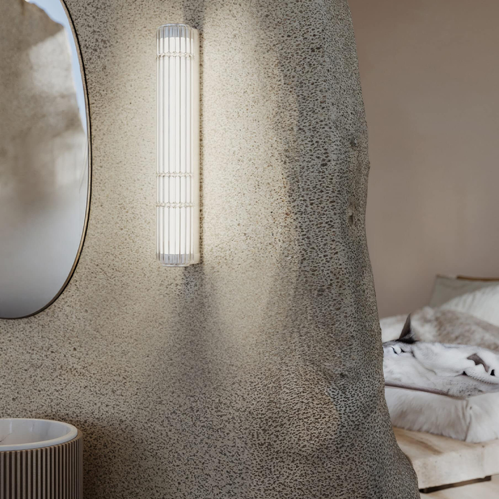 Stacking-serien fra Leucos, designet af Rockwell Group, videreføres her i en mere arkitektonisk og raffineret udgave. Denne version er udført med riflet, mundblæst borosilikatglas, hvor den fine struktur skaber en levende brydning af lyset og tilfører lampen en diskret taktilitet. Udtrykket er roligt, men med en dybde, der træder frem, når lyset tændes.