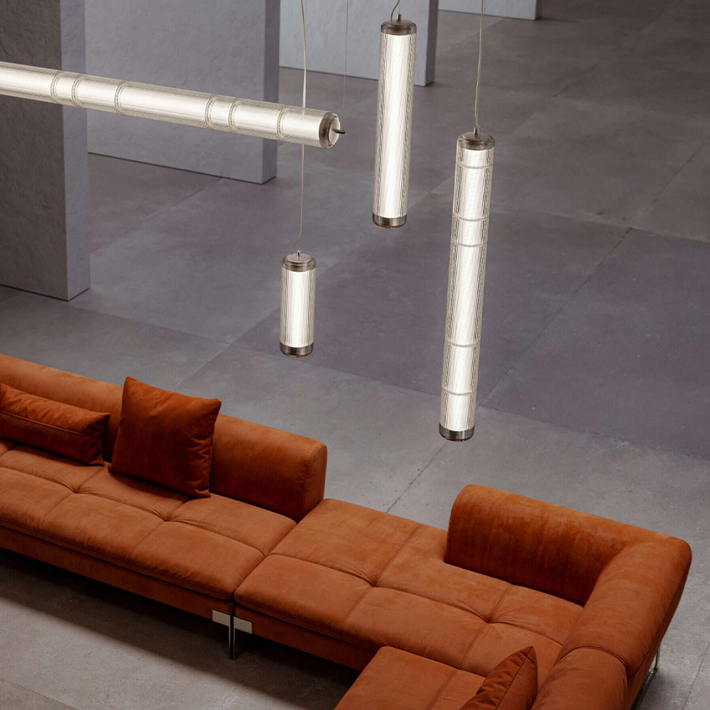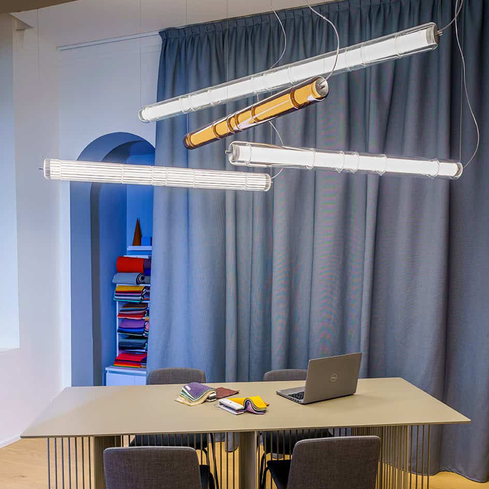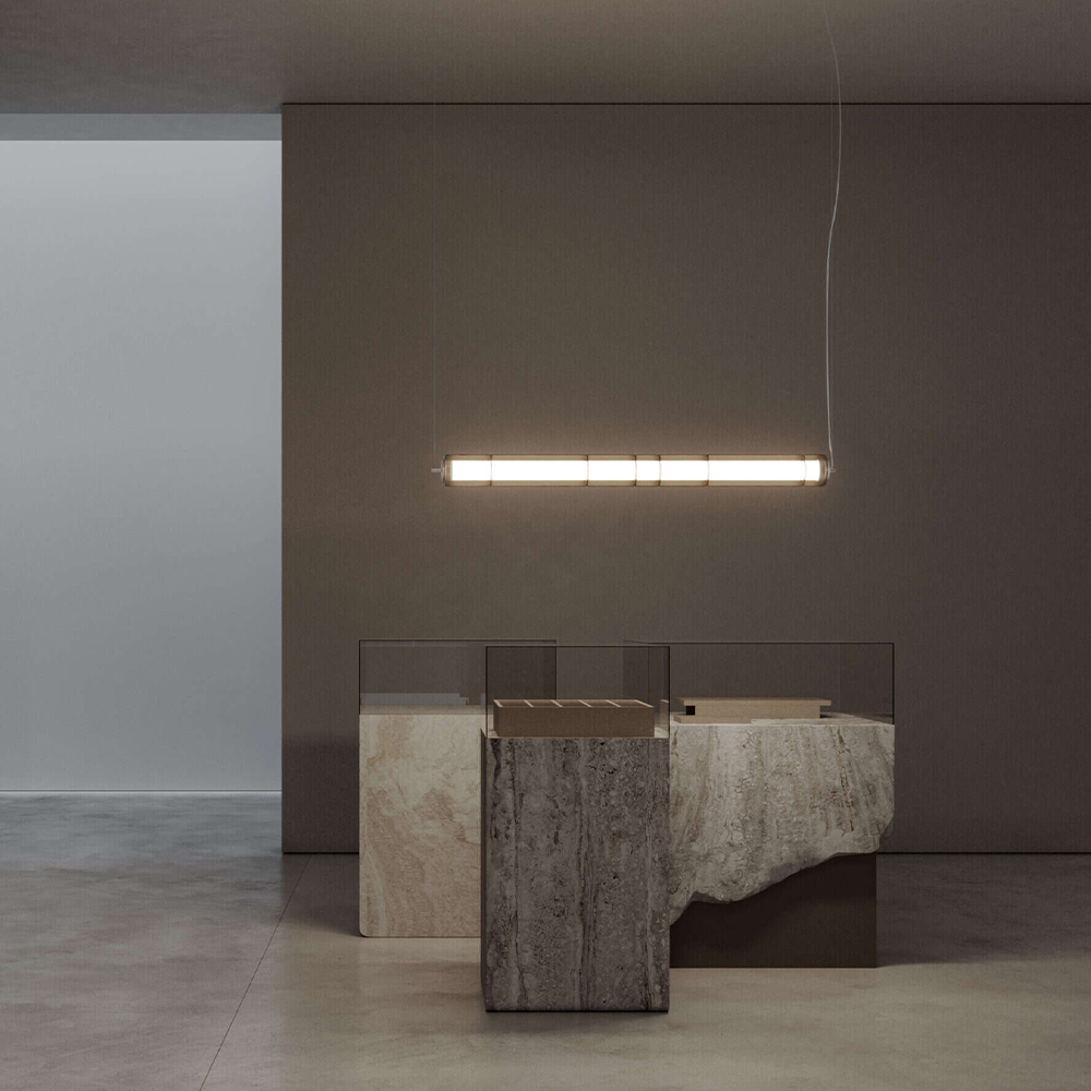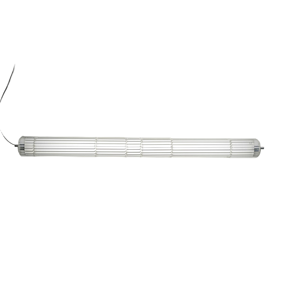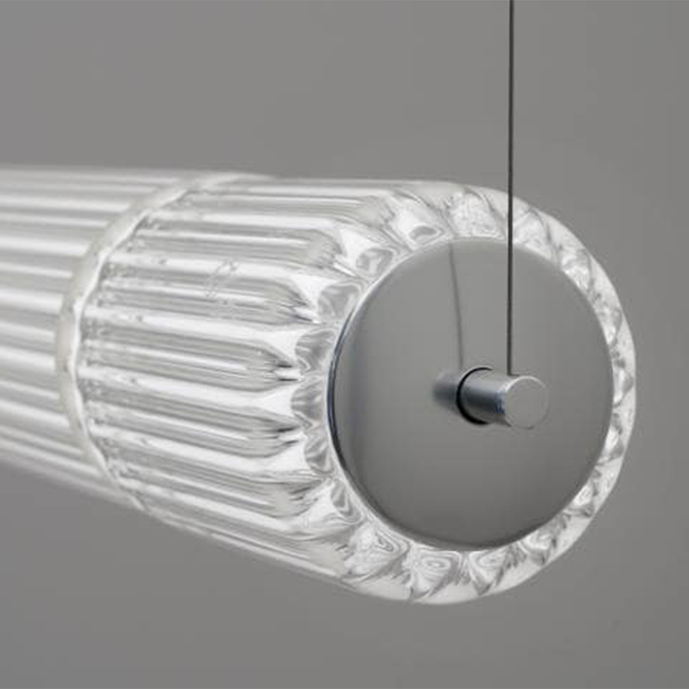 Denne horisontale version – her i 120 cm – er opbygget omkring en cylindrisk diffuser med integrerede LED-strips, der sikrer en jævn og behagelig belysning. De dekorative elementer i mundblæst borosilikatglas med den karakteristiske riflede overflade tilfører lampen et levende udtryk, hvor lyset brydes og skaber en subtil dynamik. Afslutninger i bearbejdet aluminium samler konstruktionen og fungerer samtidig som ophæng.