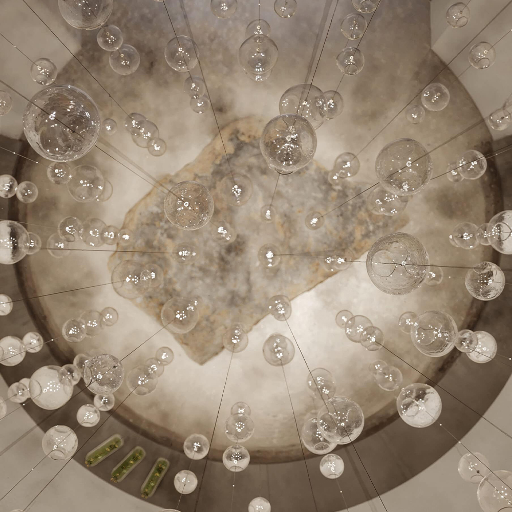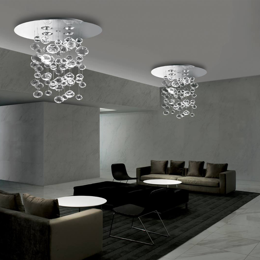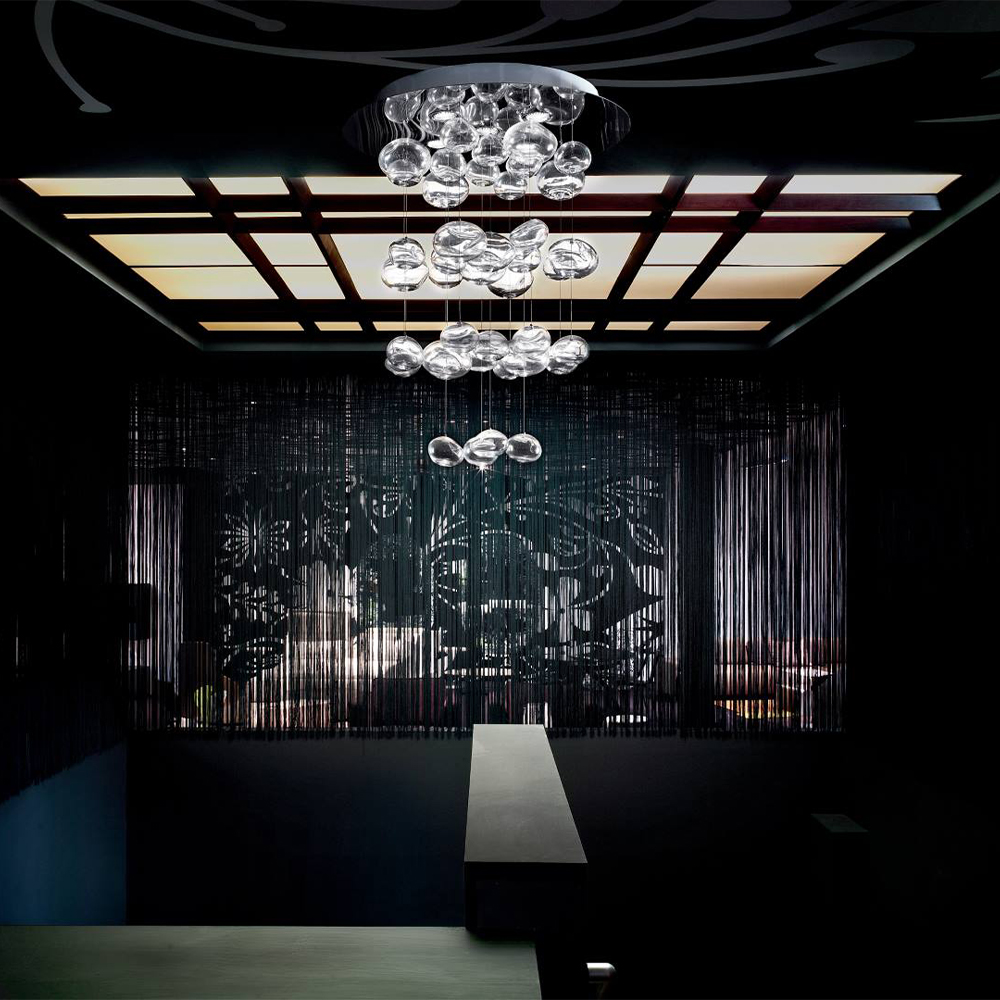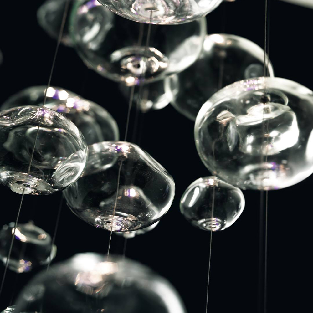 Ether er en skulpturel pendel, hvor lys og glas smelter sammen i en let og svævende komposition. Lampen består af en kaskade af mundblæste kugler i borosilikatglas, hvor hver enkelt er håndlavet med små, unikke variationer i overfladen. Det giver et levende og vibrerende udtryk, hvor lyset brydes forskelligt fra element til element og skaber en subtil, næsten poetisk atmosfære i rummet.