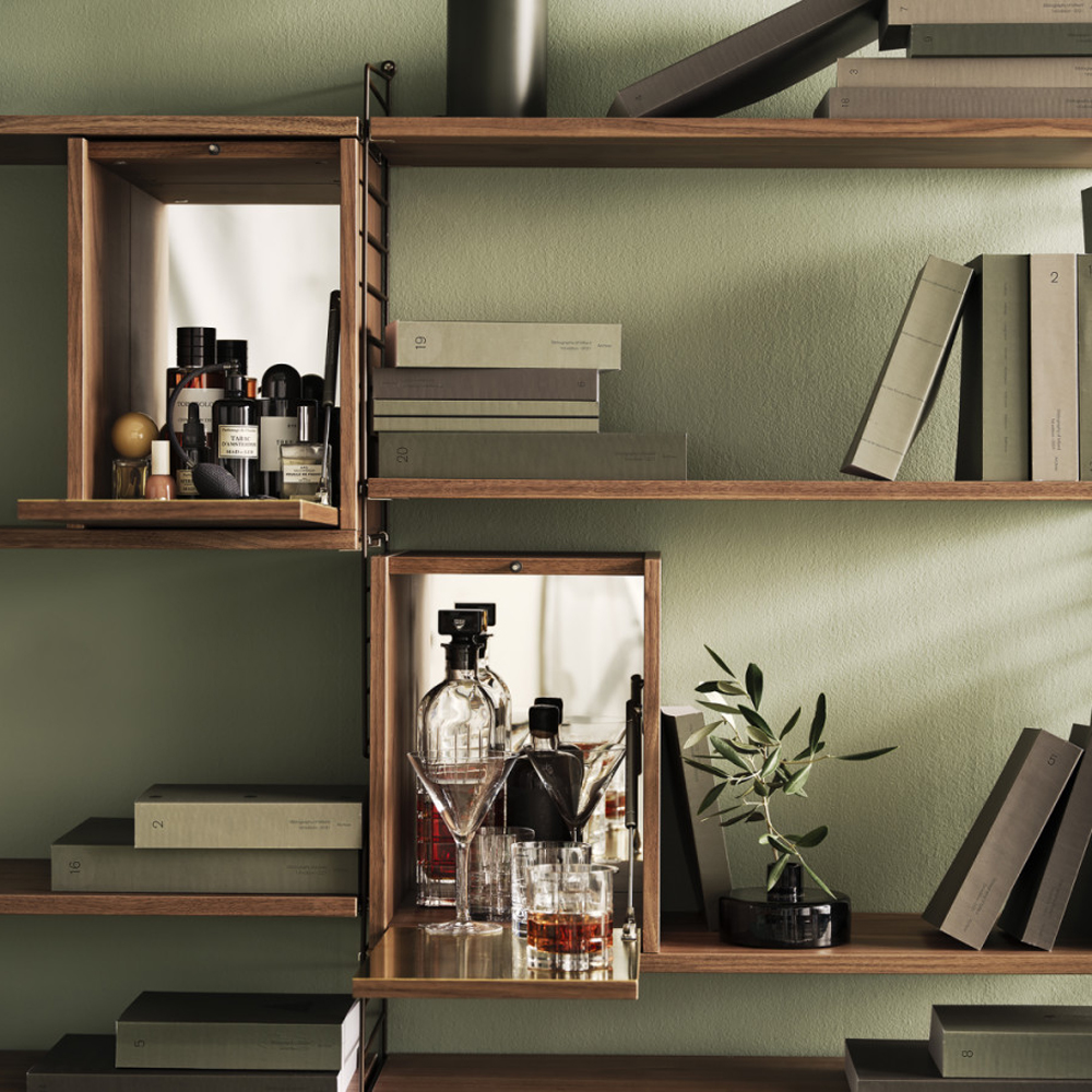 Skabet passer sammen med alle 30 cm dybe trådpaneler fra String® System. Skabet skal placeres oven på enten en træhylde eller et skab og fastgøres til en af trådpaneler.