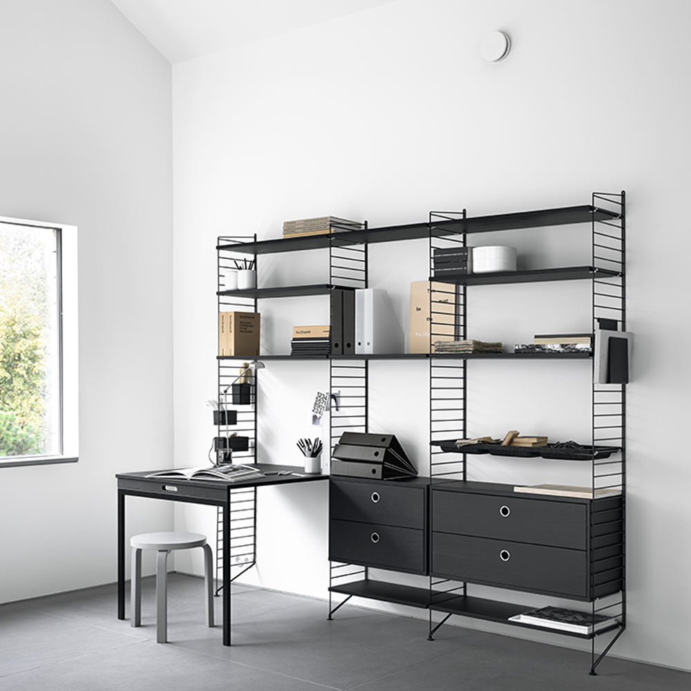Uanset om dit arbejdsområde er placeret på kontoret eller derhjemme - har String en løsning, der dækker alle dine behov. Denne to-sektions arbejdsstation giver dig masser af plads og opbevaringsmuligheder uden at optage for meget plads, samt valget om at gøre det endnu mere ryddeligt ved at folde skrivebordet ned.