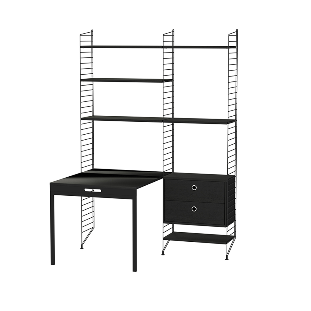 Uanset om dit arbejdsområde er placeret på kontoret eller derhjemme - har String en løsning, der dækker alle dine behov. Denne to-sektions arbejdsstation giver dig masser af plads og opbevaringsmuligheder uden at optage for meget plads, samt valget om at gøre det endnu mere ryddeligt ved at folde skrivebordet ned.