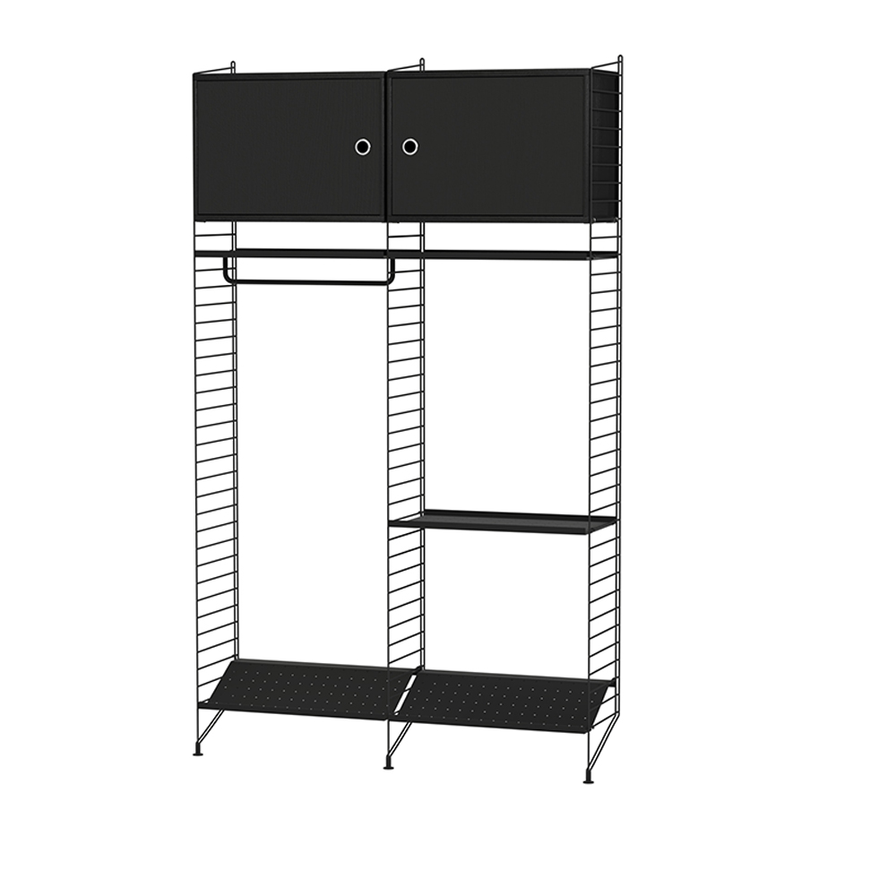 Den optimale String kombination til din entré. Gulvpaneler, metalhylder med lav kant, skohylder, skabe, bøjlestænger og kroge. Denne kombination af reoler i entréen vil tage sig af alt dit overtøj, tasker og sko, samtidigt med at den også giver dig mulighed for skjult opbevaring