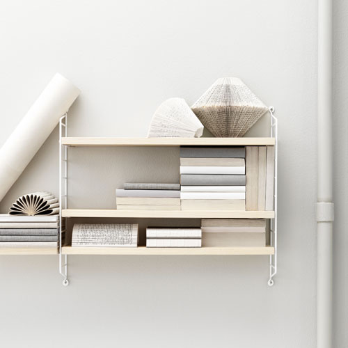 String Pocket har et let design, men er et stabilt hylde- og reolsystem. Systemet kan bruges til bøger, legetøj, eller nips, og den passer ind i ethvert rum. Bøger, dvd'er eller hvad man ellers måtte finde på bliver holdt godt og sikkert på plads af de to paneler. String Pocket er dekorativ, hvad enten den sættes op på en stor eller lille væg, og systemet kan nemt udvides ved at tilføje et modul under, over eller ved siden af. Reolen er let at montere, og hylderne er lette at flytte op eller ned. Systemet består af 3 hylder og 2 gavle.