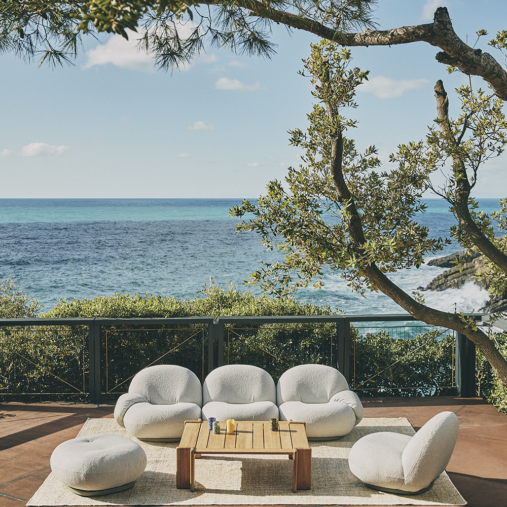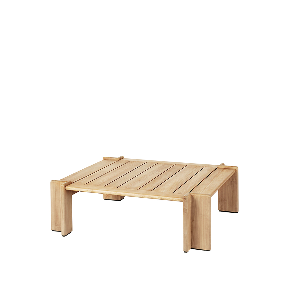 Bordenes enkle æstetik bevarer en underspillet balance med klassiske referencer uden, at være for formel. Bordpladerne er lavet af rytmiske, gentagne lameller af massiv, premium teak, omsluttet af en ramme lavet af de samme lameller, hvilket giver en minimalistisk følelse. Bordbenene er dannet af to lodrette lameller, der skaber en omvendt 'L-form' på hvert hjørne. Med henvisning til arkitektonisk og maritimt design giver det usædvanlige bendesign både strukturel støtte og visuel interesse, hvilket giver stykket en vis lethed. Hvert ben rager lidt over bordpladens overflade og kulminerer i en afrundet detalje i kontrast til strukturens geometriske linjer, hvilket giver en rolig ro til designet.