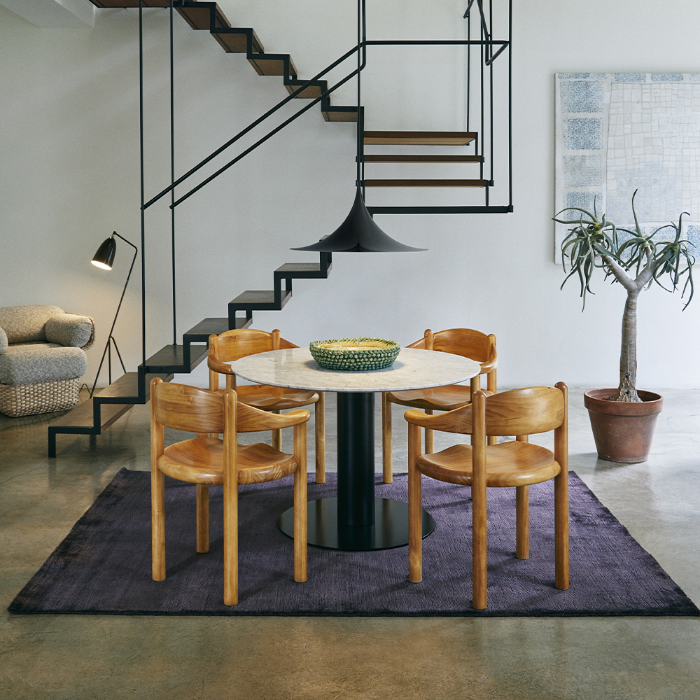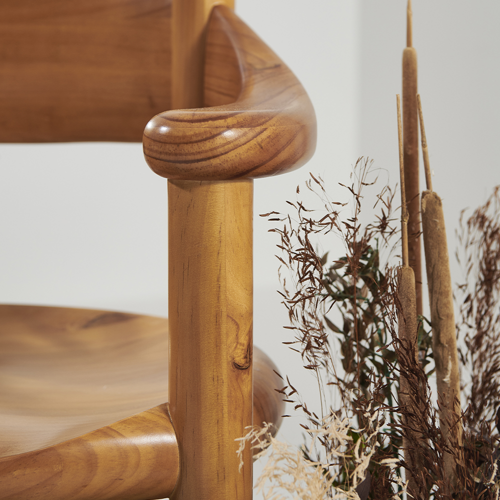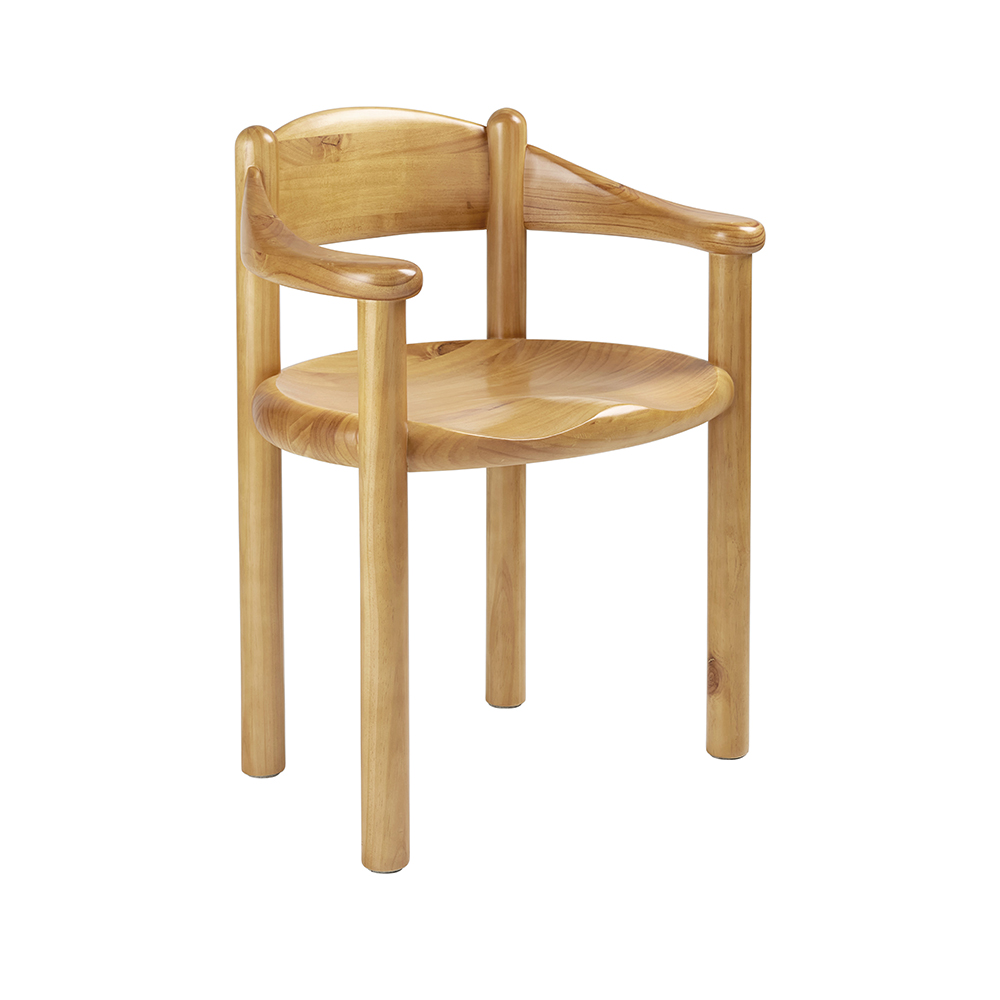 Danske Rainer Daumiller designede Daumiller Armchair i 1970'erne. Stolen blev da produceret på Hirtshals Savværk. Daumiller Armchair fra Gubi er en skulpturel stol i en simpel form. Stolen er udformet i fyrretræ og er lakeret. Fyrretræet giver en retro følelse og udtryk. Spisestolen har ryg og sæde i en ergonomisk korrekt tilpasning, således kroppen bliver omfavnet.