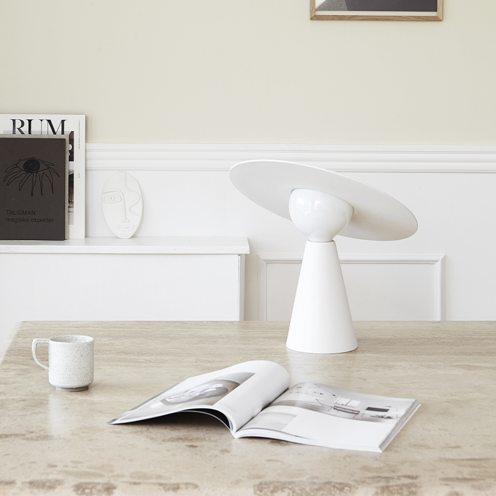 En lampe med skulpturel form, der kan lyse i alle retninger. Du skal blot dreje lampeskærmen op, ned eller rundt og koncentrere lyset i en hvilken som helst retning. Placer den på en hylde, et vindue, et sidebord eller en bænk og brug den som baggrundslys eller direkte lys.