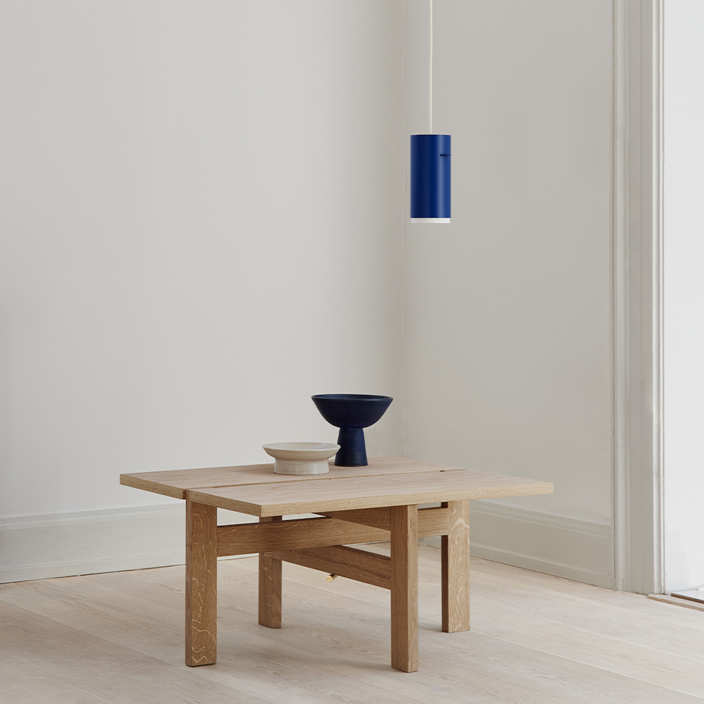 Rektangulært sofabord er lavt i profil og står kun 30 cm fra gulvet. Den korsformede benramme giver en følelse af plads ved at ophænge bordpladen langs midten og