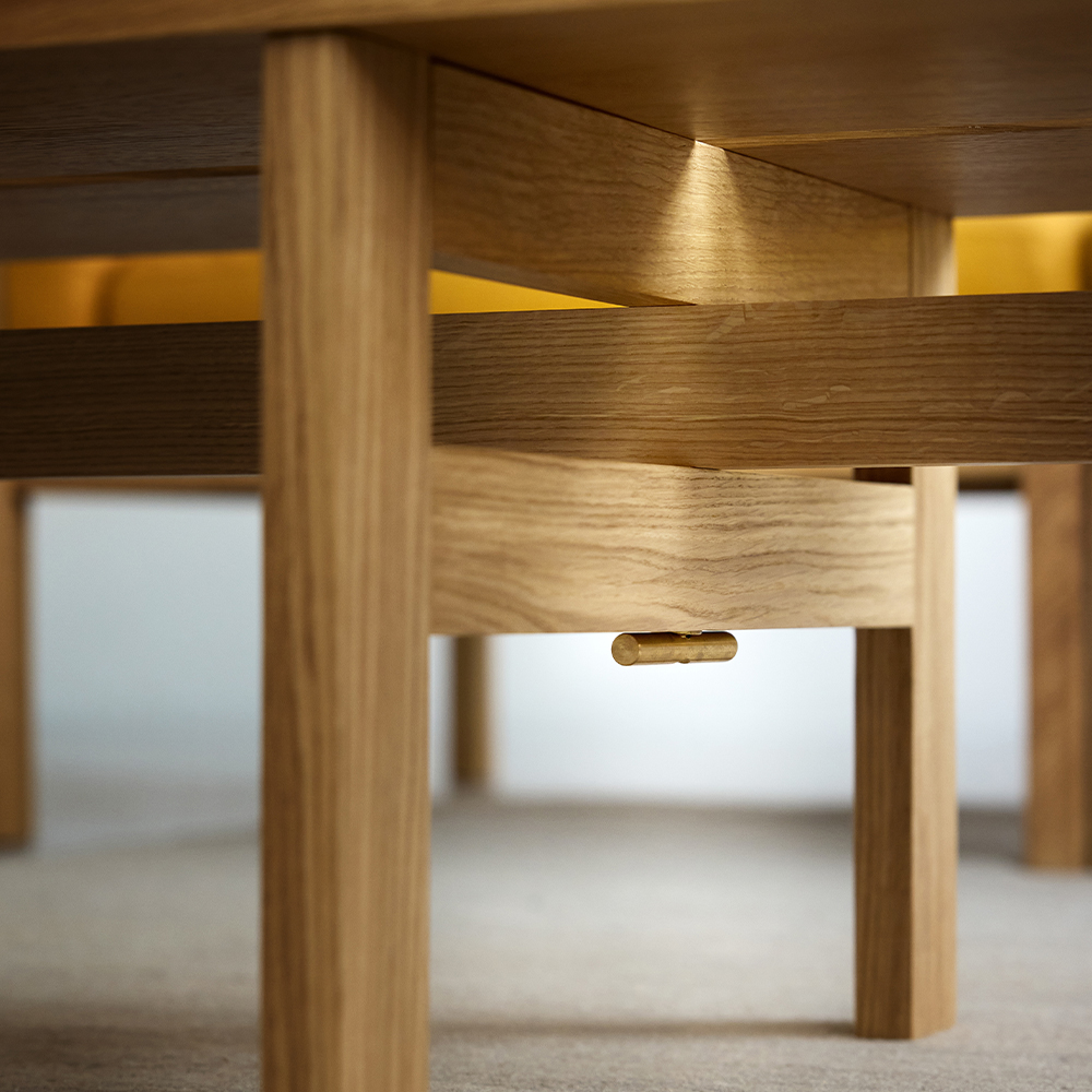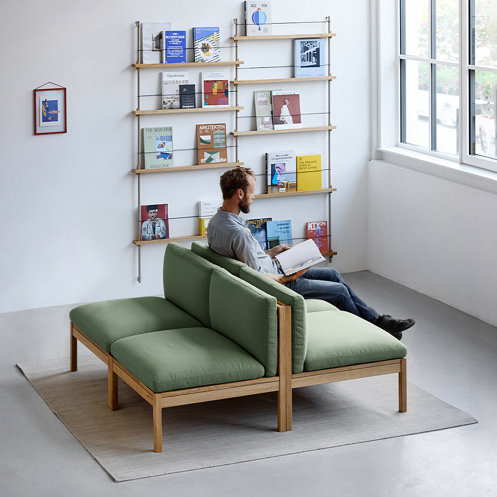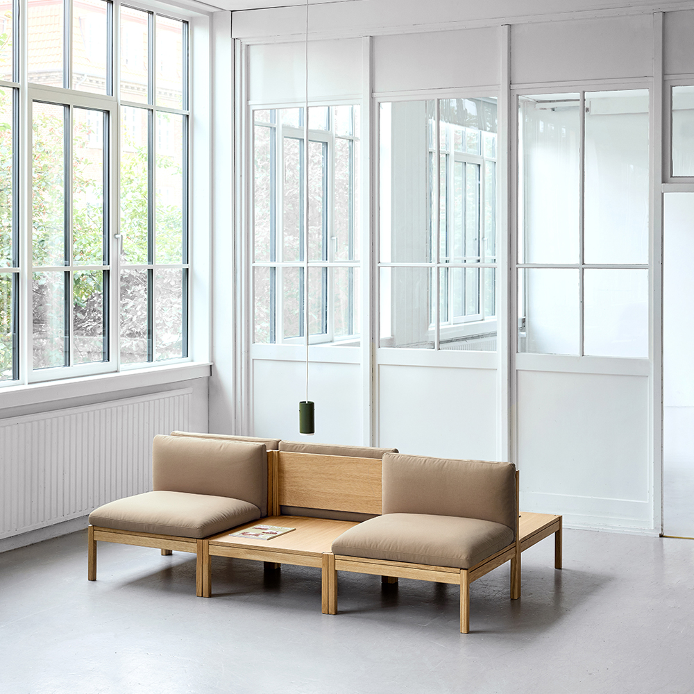 Modular Sofa fra MOEBE er skabt ud fra en enkel idé: at en sofa skal kunne tilpasses livet omkring den. Systemet består af blot få grundmoduler, som kan kombineres på utallige måder – fra en enkel loungestol til større sofaopstillinger med vinkler, mellemrum eller integrerede bordmoduler. Udtrykket er let og arkitektonisk med den synlige egetræsramme, hvor konstruktionen bliver en naturlig del af designet. Opstillingen vist her er blot ét eksempel på, hvordan modulerne kan sammensættes.