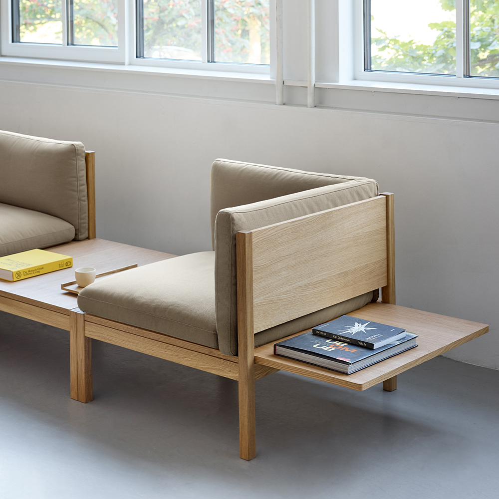 Modular Sofa fra MOEBE er skabt ud fra en enkel idé: at en sofa skal kunne tilpasses livet omkring den. Systemet består af blot få grundmoduler, som kan kombineres på utallige måder – fra en enkel loungestol til større sofaopstillinger med vinkler, mellemrum eller integrerede bordmoduler. Udtrykket er let og arkitektonisk med den synlige egetræsramme, hvor konstruktionen bliver en naturlig del af designet. Opstillingen vist her er blot ét eksempel på, hvordan modulerne kan sammensættes.